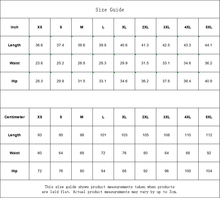| Waist | 60 | 64 | 68 | 72 | 76 | 80 | 84 | 88 | 92 |