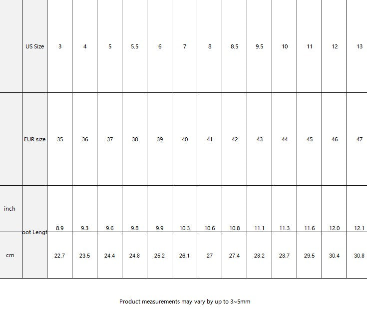 | US Size | 3 | 4 | 5 | 5.5 | 6 | 7 | 8 | 8.5 | 9.5 | 10 | 11 | 12 | 13 | |